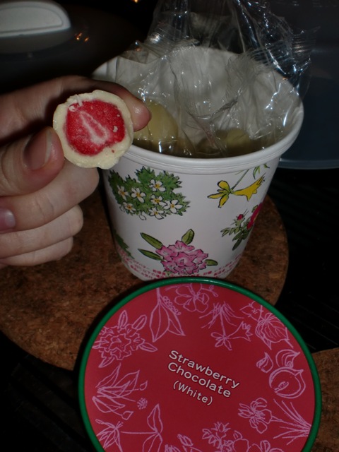 这个也是六花亭的,草莓包巧克力。草莓酸酸的,加了外层的甜巧克力,刚刚好。你千万别以为里面是新鲜的草莓,它其实是干的,有点脆脆的,不懂是不是因为我放进了冰箱的关系,还是本来就酱的。